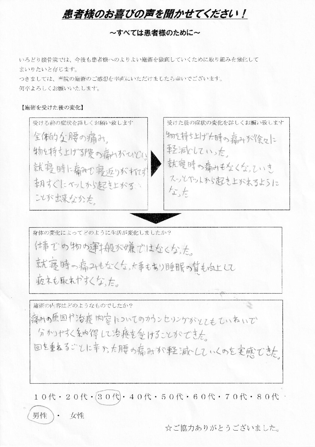 就寝時の痛みもなくなったこともあり睡眠の質も向上して疲れも取れやすくなった。