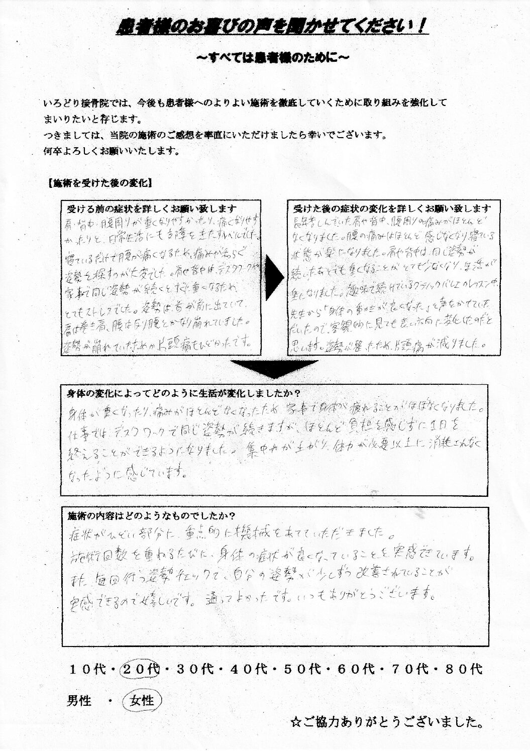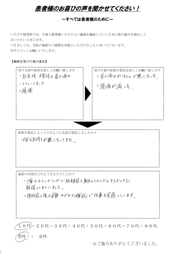 施術を受けてからは、こりが良くなっていき、苦痛を感じなくなりました。