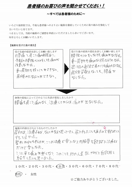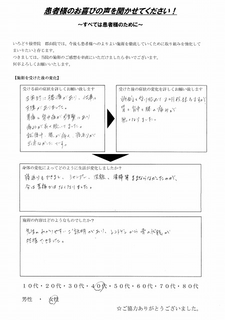 腰痛については1ヶ月を過ぎてから全く気にしないようになり、変わらずにデスクワークも続けていますが、施術前のような症状もなくなりました。