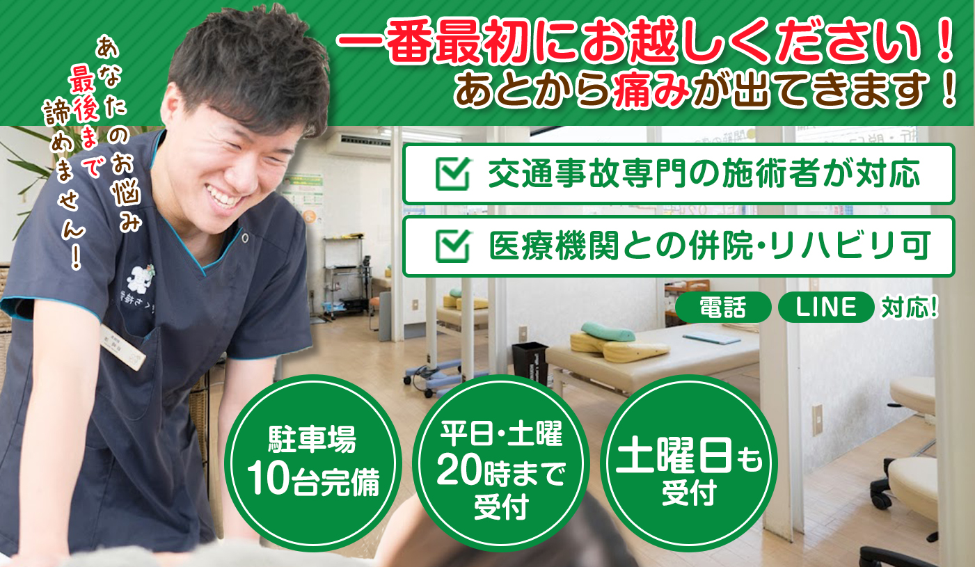 自賠責保険適用により窓口負担0円で治療を受けていただけます。また、平日・土曜日は20時まで受付しており、お仕事帰りでも安心してご来院いただけます。保険会社との面倒な手続きも当院がサポートいたします。