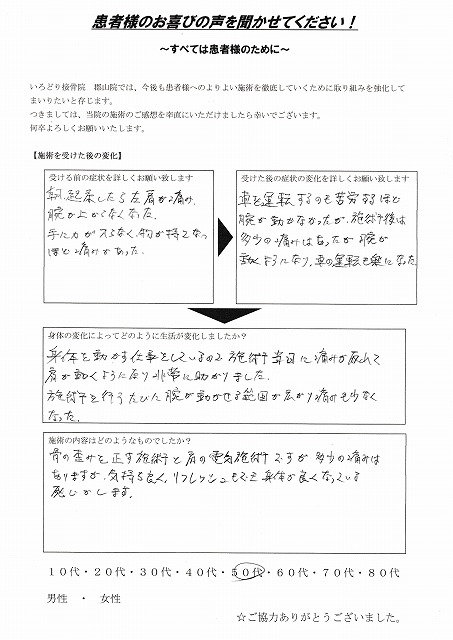 仕事中、体の痛みや頭痛などが時折あったが、施術を受けてからは頻度が大分少なくなった。