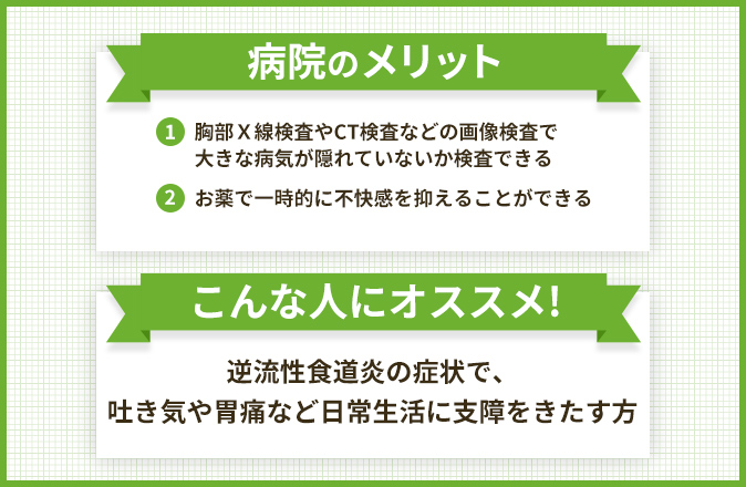 しかし、この下部食道括約筋が緩んでしまうことで胃の内容物の逆流が起こります。代表的な症状は胸やけや食後の胸痛で、就寝中に慢性的な逆流が生じている場合は咳、喉の違和感、声のかすれなどが起こることがあります。