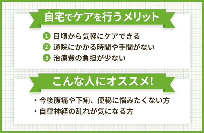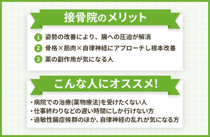 IBSは20〜40代の働き盛り世代に多く、ストレスや不安などの精神的な要因が深く関わっているため、薬物療法だけに頼らず、身体の構造と機能を整えることで自律神経のバランスを改善し、症状の軽減と再発防止を目指したアプローチを行っています。