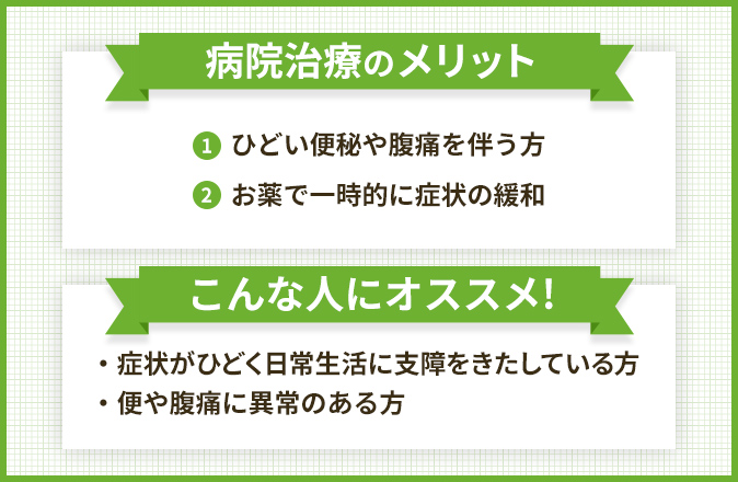 ・腸に目立った炎症や病変は見られない(大腸がんや潰瘍性大腸炎とは異なる)