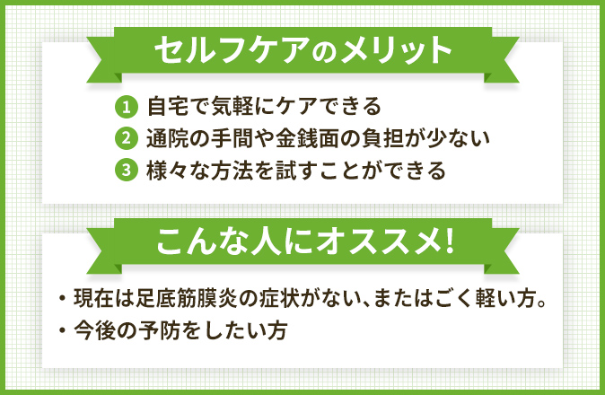 湯船に浸かり全身の筋肉をほぐすことで痛みが和らぐことが期待できます。アキレス腱やふくらはぎのストレッチ、足首のマッサージも効果的です。血流が良くなり冷えも緩和されます。足を休ませて疲労を回復させることが大切です。日常生活では靴にインソールを入れて足への負担を和らげる方法も有効です。