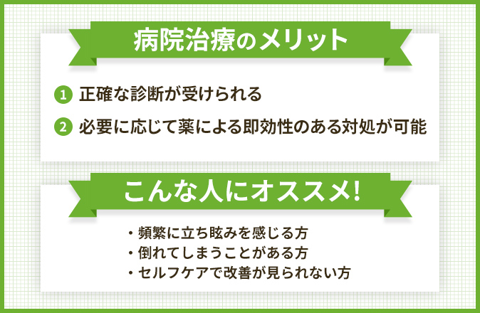 病院治療では、血液検査による貧血や内科的疾患の確認、起立性低血圧や自律神経機能の検査、薬物治療(鉄剤や自律神経調整薬など)が行われます。専門家による適切で安全なケアが受けられ安心感がありますが、継続的な通院が必要で、薬の副作用が出る場合もあります。