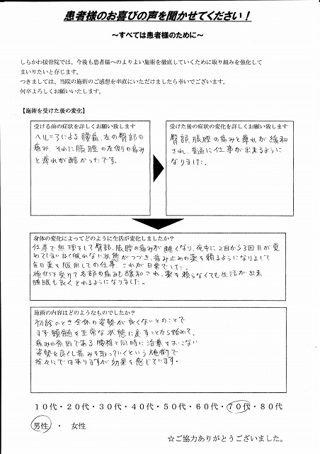 臀部、脹脛の痛みと痺れが緩和され、普通に仕事が出来るようになりました。