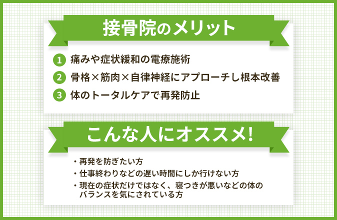 病院では画像診断により、手術が必要かどうかを早期に判断してもらえます。また、注射や鎮痛剤を処方してもらえるため、痛みの強い方は即効性を感じることができます。しかし、手術を受ける場合はリハビリ期間を要し、注射や鎮痛剤は根本原因の解決にはならないため、症状が再発する可能性があります。当院では、医療機関での治療と並行して、根本的な身体の改善を目指した施術を提供いたします。